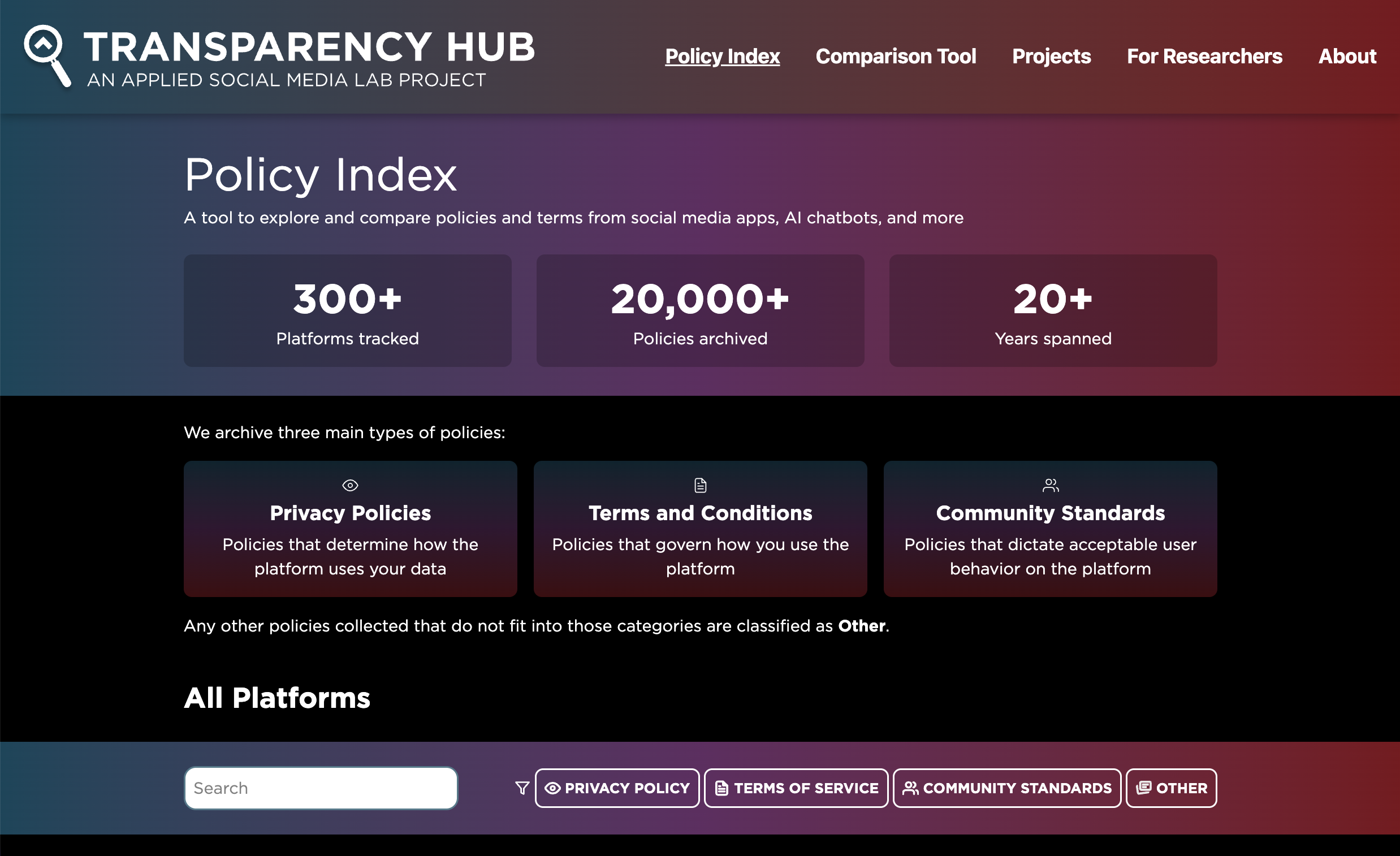 Transparency Hub is a user-friendly platform that aggregates and archives the policy documents (and associated data) that social media companies release. The platform is focused on increasing visibility into how data flows through the social media ecosystem.