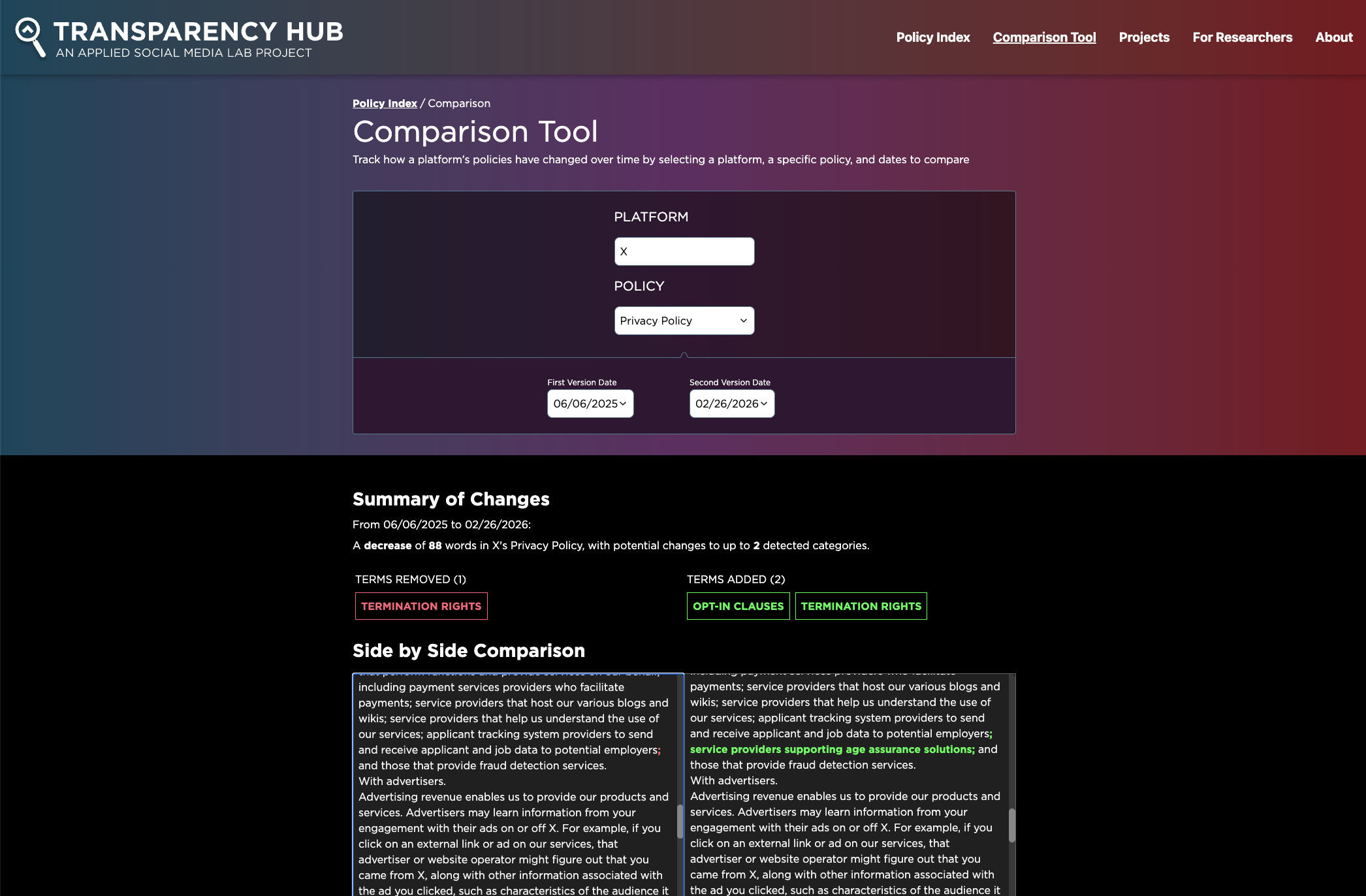 Tools for users: Transparency Hub provides several interfaces for querying our database. For example, users can browse documents by platform, exploring a platform’s current documents and comparing those to archived policies to understand how the policies have evolved. There’s also a helpful tool to compare documents across platforms. Using AI models, Transparency Hub also intends to offer automated document summarization and recommendations for how users can modify their platform settings to better safeguard personal data.